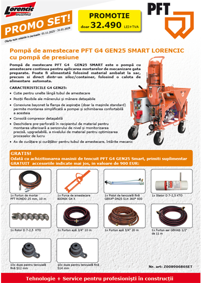 Pompă de malaxare PFT G4 smart, 6,05kW, 400V, cu pompă ridicătoare de presiune. Set PROMO - accesorii incluse, Unitate ST